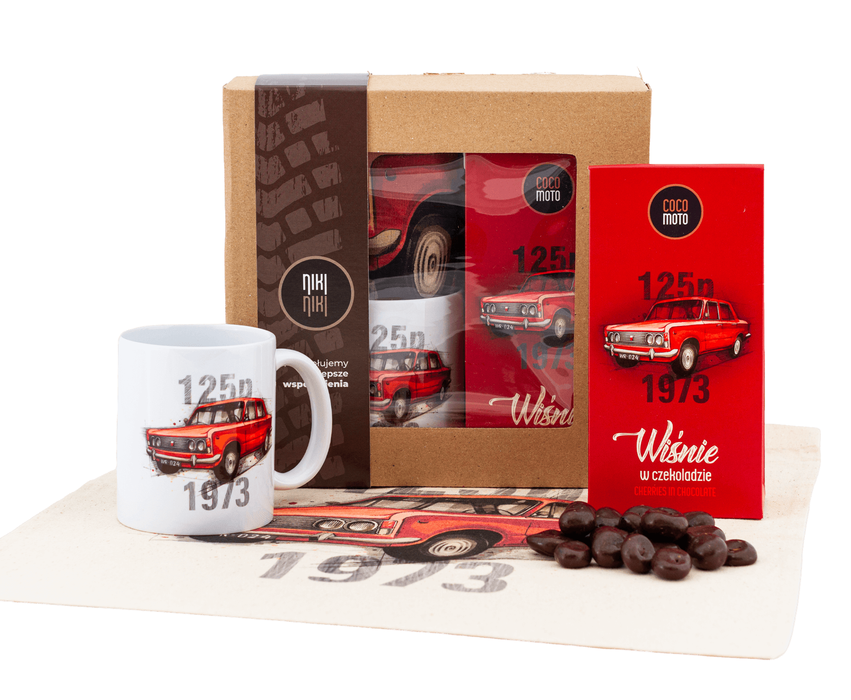 Pewnie ciekawi Cię, co znajdziesz w środku? Już wyjaśniam! Fundamentem zestawu jest ceramiczny kubek oraz bawełniana torba – oba ozdobione wizerunkiem kultowego 125p. Aby osłodzić sentymentalną podróż, dorzuciliśmy 125 g pysznych czekoladowych cukierków. Co ważne, Fiat 125p był następcą Warszawy i symbolem nowoczesności PRL-u. Ten zestaw to hołd dla auta, które przez 24 lata zjeżdżało z taśm FSO, podbijając serca milionów ludzi. To nie jest zwykły gadżet, to kawałek historii motoryzacji w zasięgu Twojej ręki.